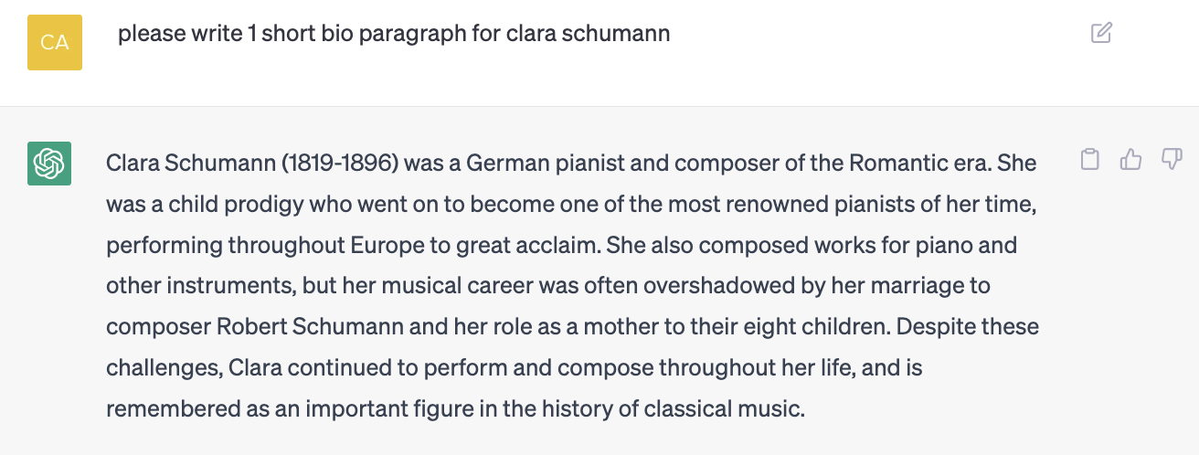 If you have a newsletter for your students’ families, ChatGPT can help with various segments! For a Composer of the Month segment, you can easily generate short bios for the composer.