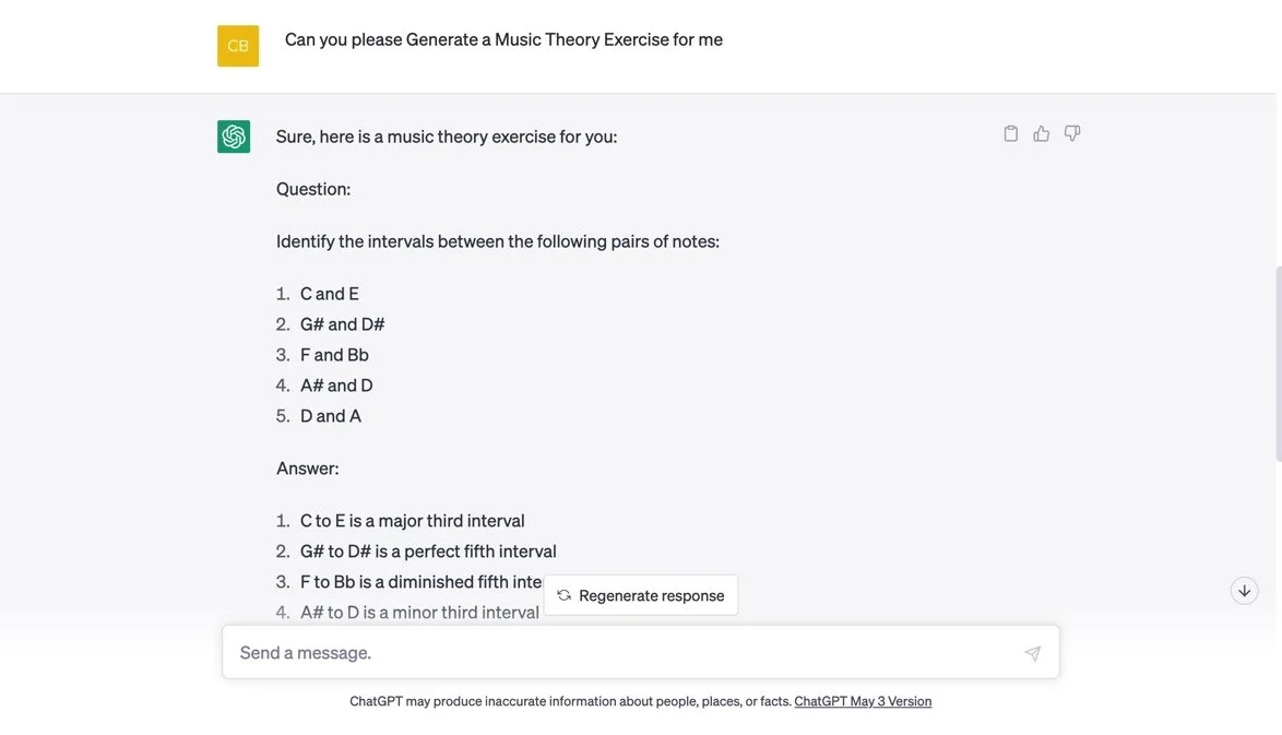 You can use ChatGPT to generate music theory exercises or technique exercises for your students! All you have to do is input the type of exercise they need, such as identifying chords or naming intervals. Then, ChatGPT will instantly create a customized exercise for your students to complete. As you know, these exercises can help your students practice their music theory skills and reinforce what they’ve learned in class. It’s such a quick and easy way to create worksheets for your students!