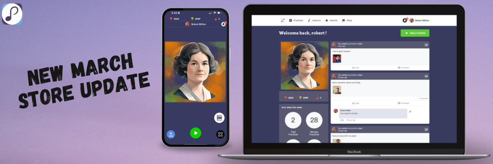 Each new composer avatar can be redeemed in the Practice Space store using Practice Gems, which students earn by meeting their daily practice goals. The store turns consistent practice into motivation—while encouraging students to connect with the people and history behind the music they study.